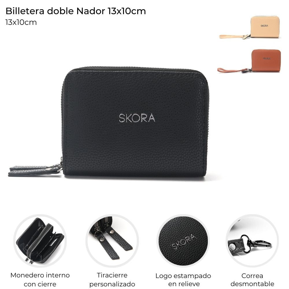 Billetera TwinZip en cuero sintético resistente y fácil de limpiar. Su diseño incluye doble cierre seguro y correa adicional para mayor practicidad. Medidas: 13 x 10 cm. Ideal para uso diario, combina estilo y funcionalidad.