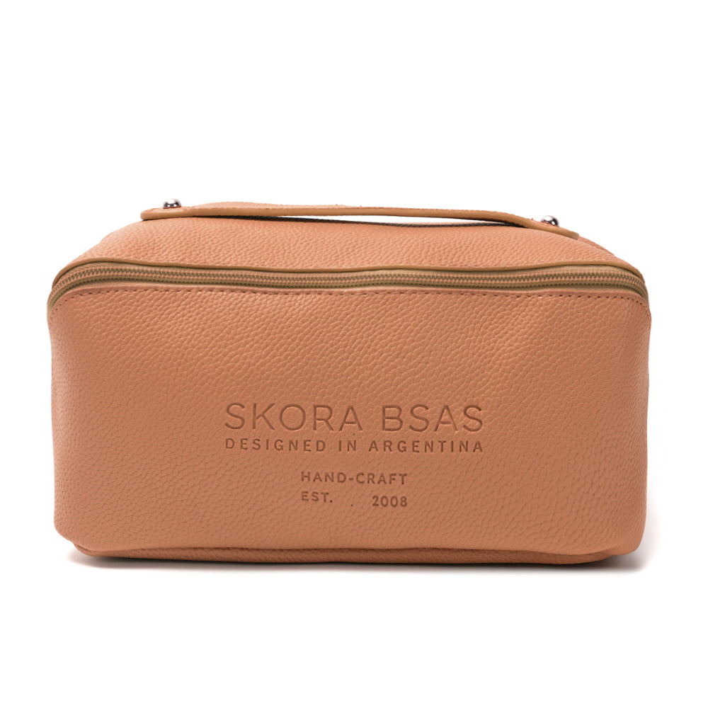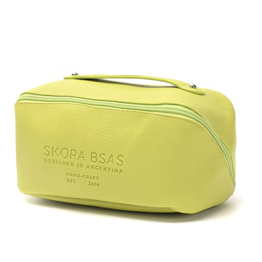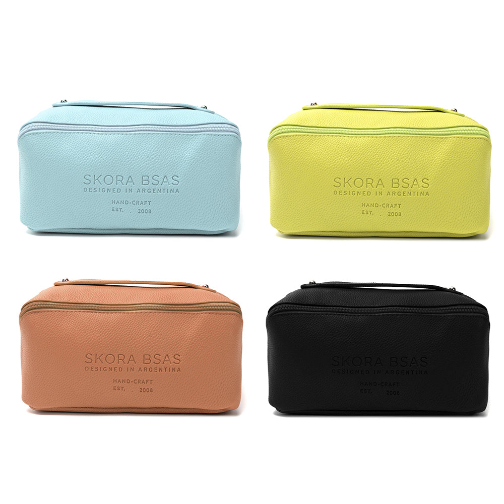 Portacosméticos Angela en eco cuero con cierre boca de pez, manija superior y detalle de marca frontal. Práctico, elegante y cómodo para viaje o uso diario.