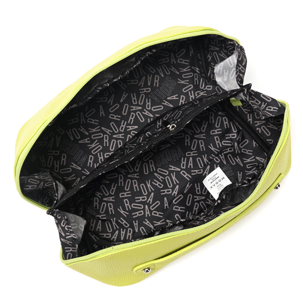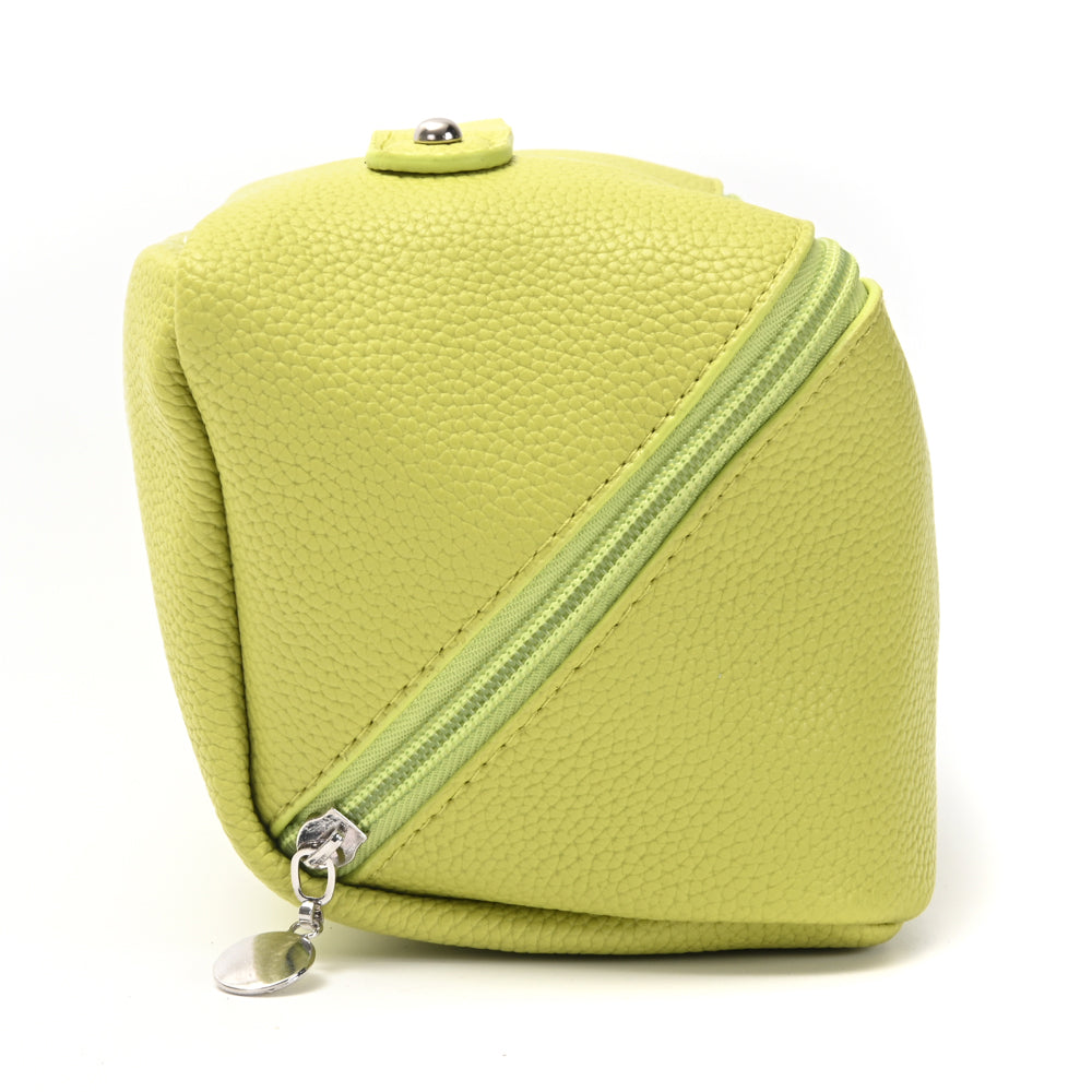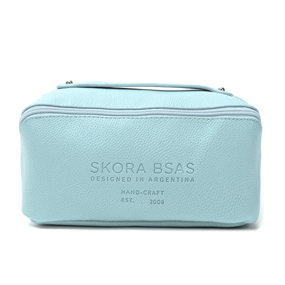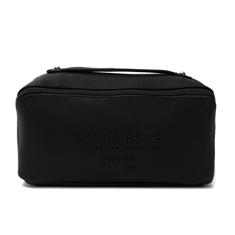 Portacosméticos Angela en eco cuero con cierre boca de pez, manija superior y detalle de marca frontal. Práctico, elegante y cómodo para viaje o uso diario.