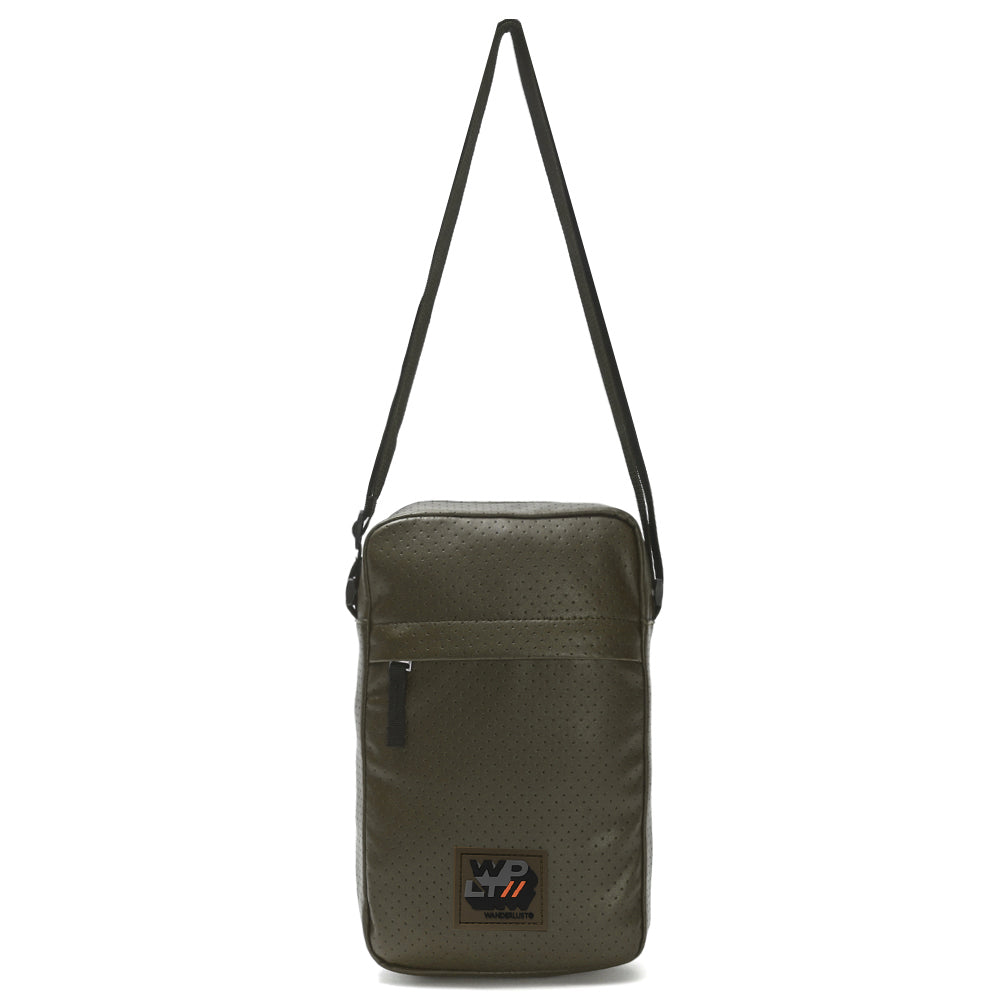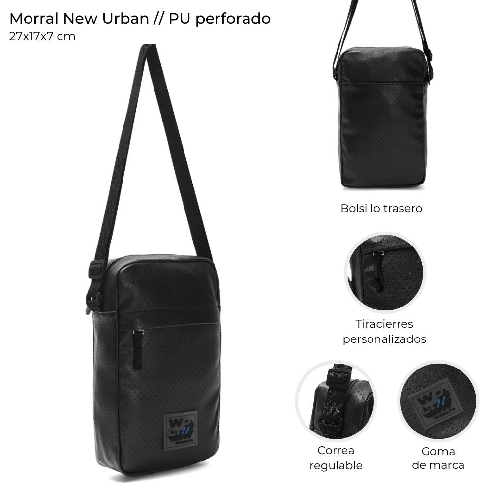 Morral Atlas en cuero sintético microperforado, con logo en relieve, correa regulable y bolsillo trasero para estilo y funcionalidad refinada.