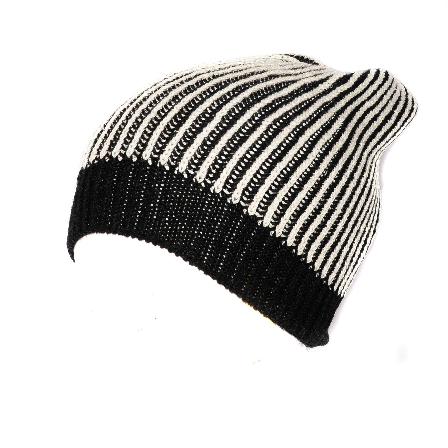 Gorro tejido morley a rayas anchas en tonos blanco y negro.