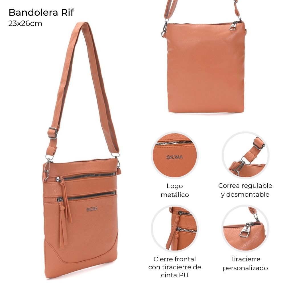 Bandolera Canyon de diseño compacto con doble cierre. Confeccionada en cuero sintético resistente. Incluye correa regulable y desmontable para mayor comodidad. Medidas: 23 x 26 cm.