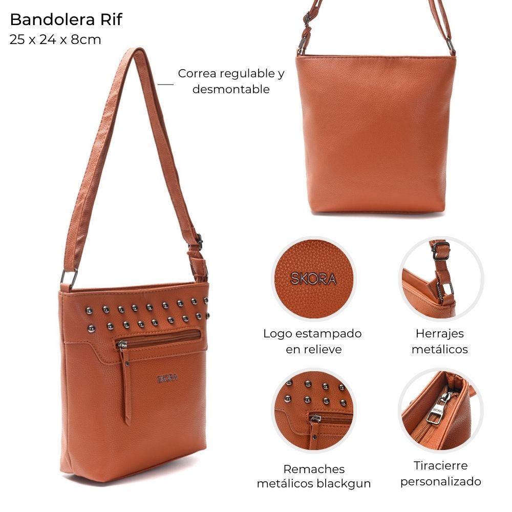 Bandolera confeccionada en cuero PU texturado con detalles de tachas metálicas. Medidas: 28 x 25 cm. Diseño moderno y resistente, ideal para complementar looks urbanos y casuales.