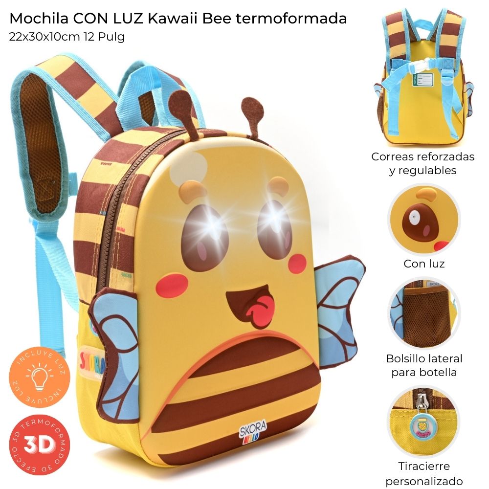 Mochila infantil Bee termoformada con luz. Confeccionada en neoprene resistente con correas reforzadas y regulables. Incluye bolsillo externo para botella de agua. Medidas: 22 x 30 x 10 cm. Diseño divertido y práctico, ideal para los más chicos.