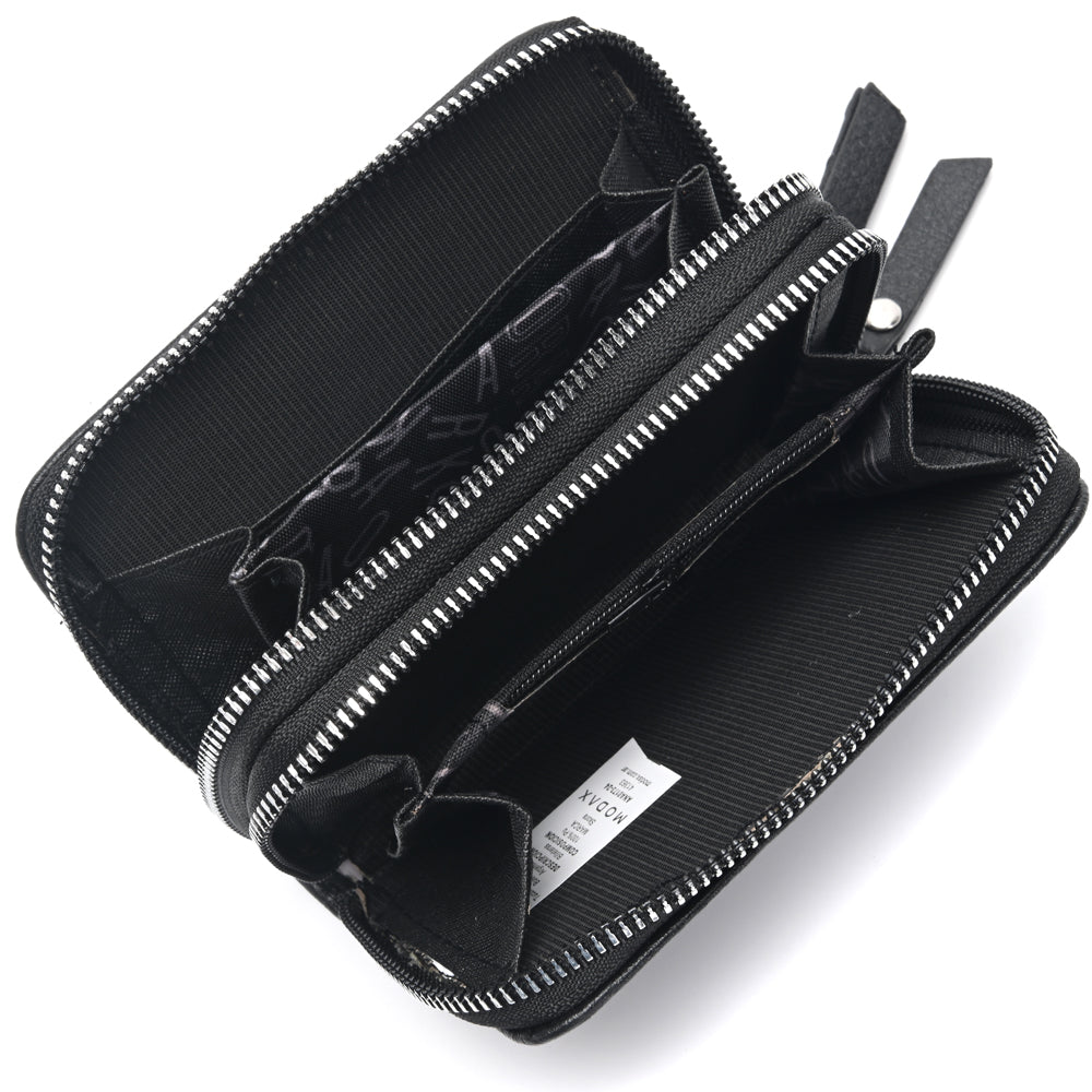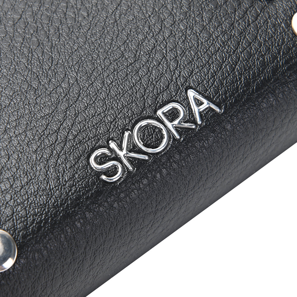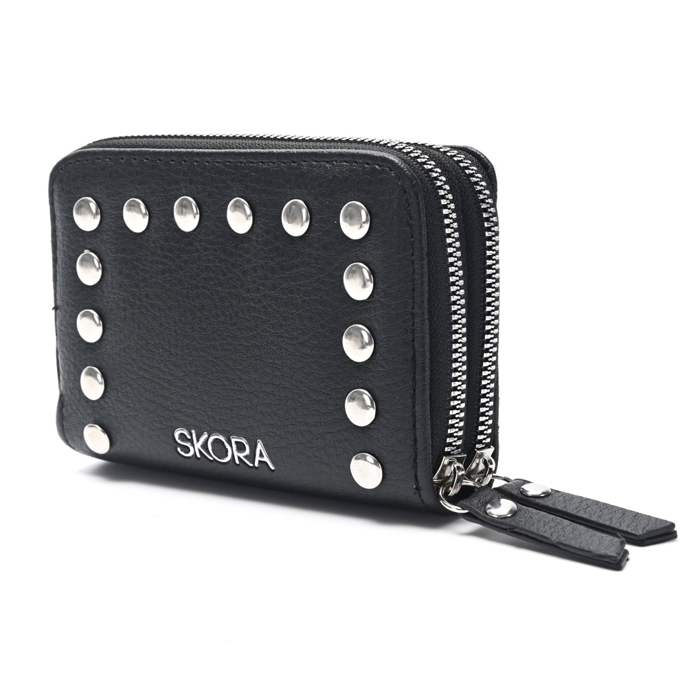 Billetera en cuero sintético con tachas audaces y logo metálico en relieve, perfecta para destacar con estilo único y atrevido.