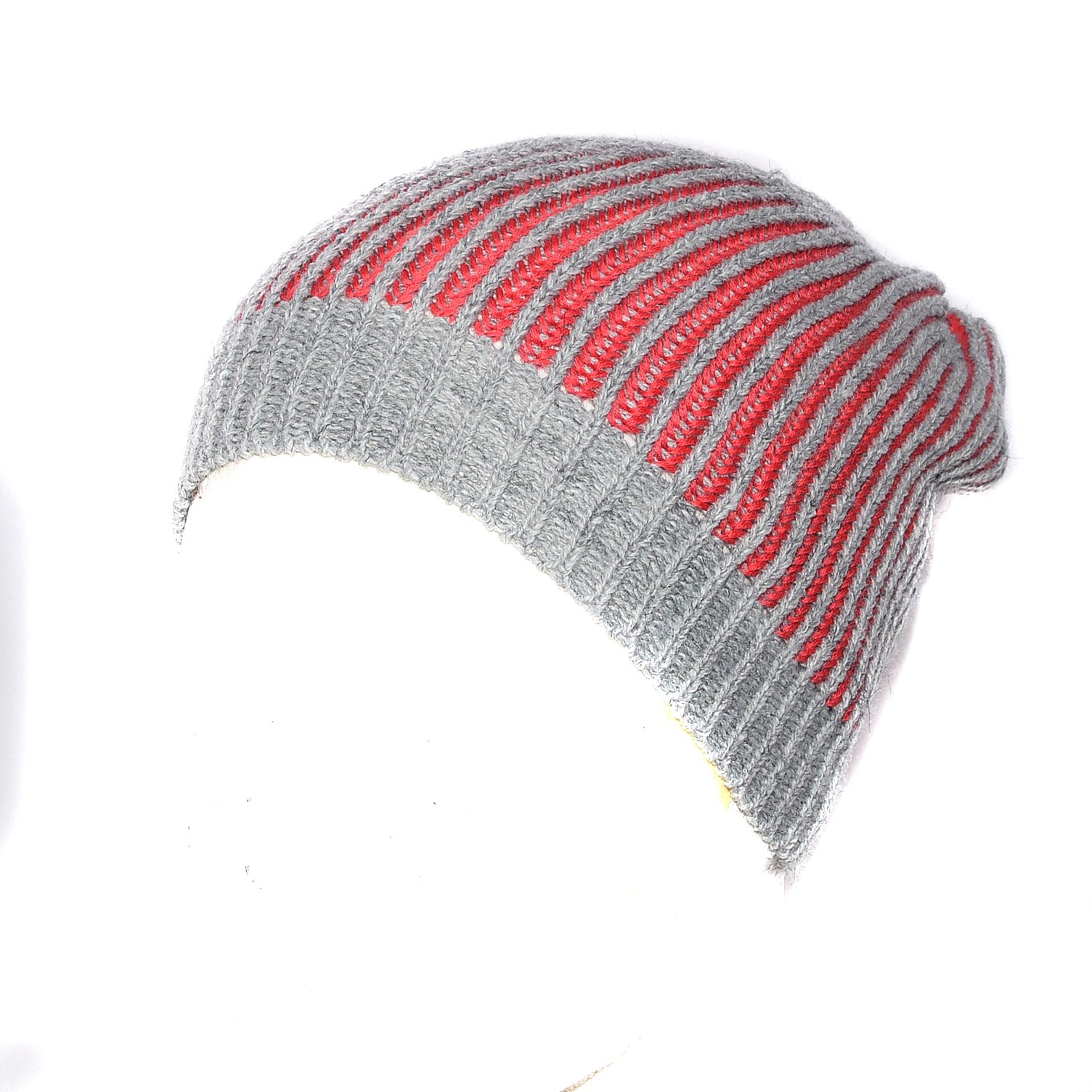 Gorro tejido morley a rayas anchas en tonos gris y rojo.