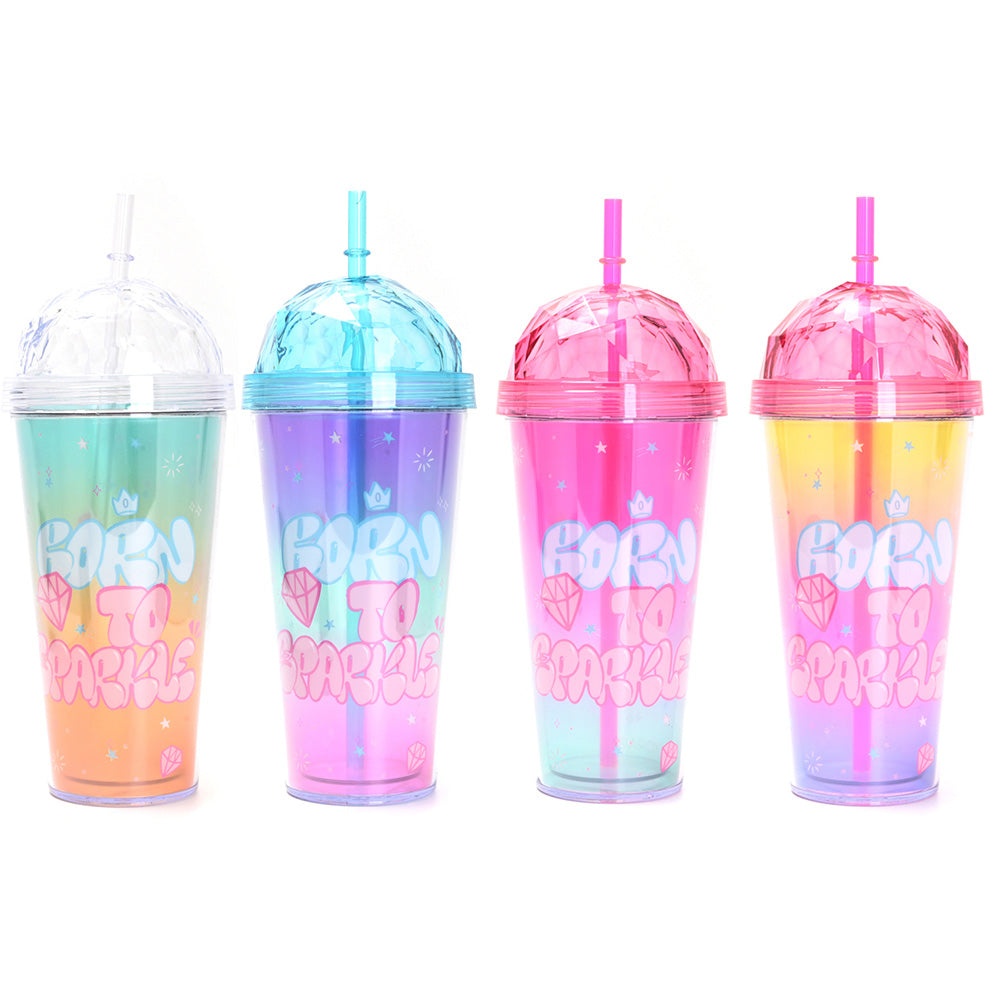 Vaso Born to Sparkle de plástico bicapa con capacidad de 400 ml. Incluye sorbete reutilizable, ideal para bebidas frías. Diseño perfecto para el día a día o salidas al aire libre.