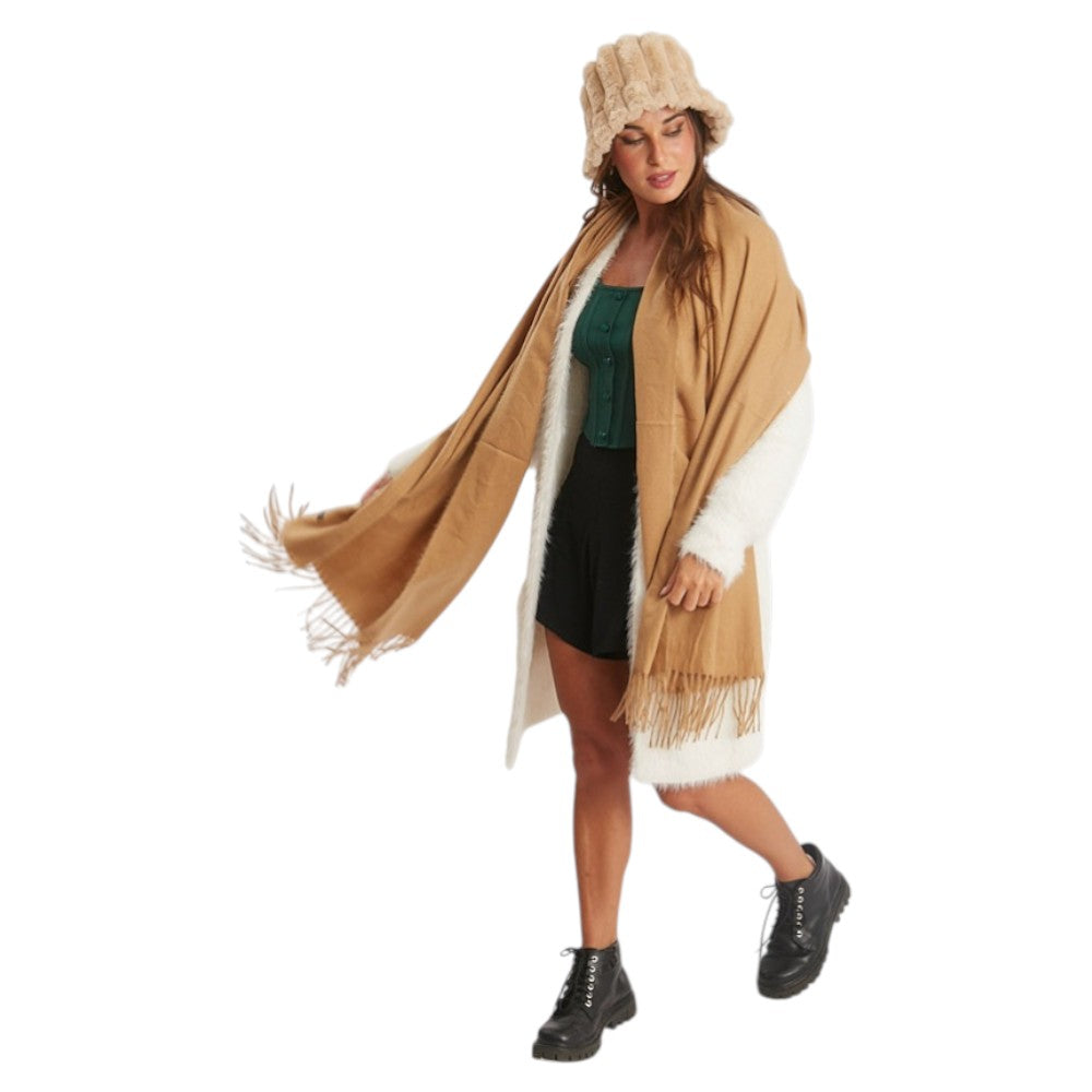Bufanda Camelie confeccionada en tejido suave en tono camel liso, con acabado uniforme y terminación con flecos en los extremos que aportan movimiento y un detalle clásico, diseño amplio y versátil ideal para usar envolviendo el cuello o como chal sobre abrigos y prendas de temporada, perfecta para complementar looks neutros y urbanos de otoño e invierno.