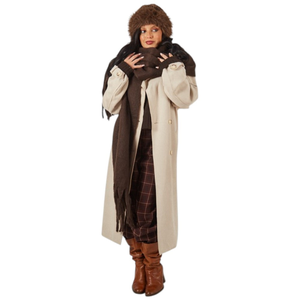 Bufanda confeccionada en tejido suave y liviano en tono gris oscuro grafito, ideal para aportar calidez y un estilo moderno al look invernal. Su formato amplio permite envolver el cuello cómodamente o llevarla sobre los hombros como chal, brindando versatilidad y abrigo con gran presencia. Terminada con flecos largos en los extremos que suman textura y movimiento, es el complemento perfecto para combinar con tapados, camperas o prendas urbanas en los días más fríos.