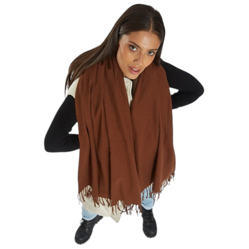 Bufanda Terra confeccionada en tejido suave en tono marrón liso, con acabado uniforme y terminación con flecos en los extremos que aportan movimiento y un detalle clásico, diseño amplio y versátil ideal para usar envolviendo el cuello o como chal sobre abrigos y camperas, perfecta para complementar looks urbanos y de temporada otoño e invierno con un tono cálido y combinable.