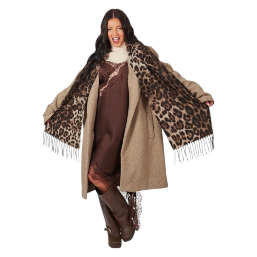 Bufandón Salvaje en tejido suave con estampa animal print en tonos marrón profundo y negro, ideal para looks más intensos y sofisticados. Su formato amplio permite usarlo envolviendo el cuello o abierto tipo chal sobre tapados y sacos, mientras que los flecos largos aportan movimiento y un aire bien power. Perfecto para destacar en otoño e invierno. Tamaño: 180 cm x 30 cm (equivalente a 70.8” x 11.8”).