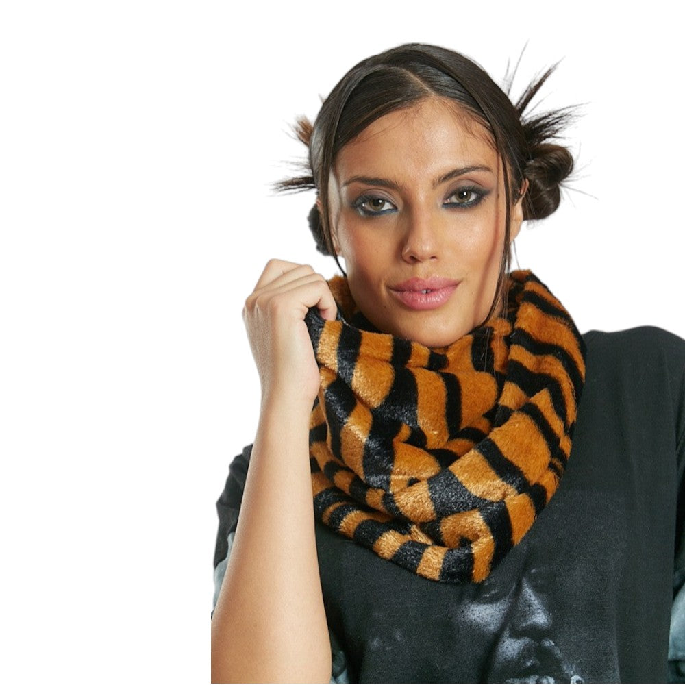 Cuello confeccionado en piel sintética ultra suave con acabado plush y diseño animal print en tonos negro y camel, ideal para aportar máxima calidez y un estilo audaz al look invernal. Su formato envolvente cubre completamente el cuello brindando abrigo uniforme, confort y textura aterciopelada agradable al contacto con la piel. Moderno y llamativo, es el complemento perfecto para destacar cualquier outfit y sumar personalidad en los días más fríos.