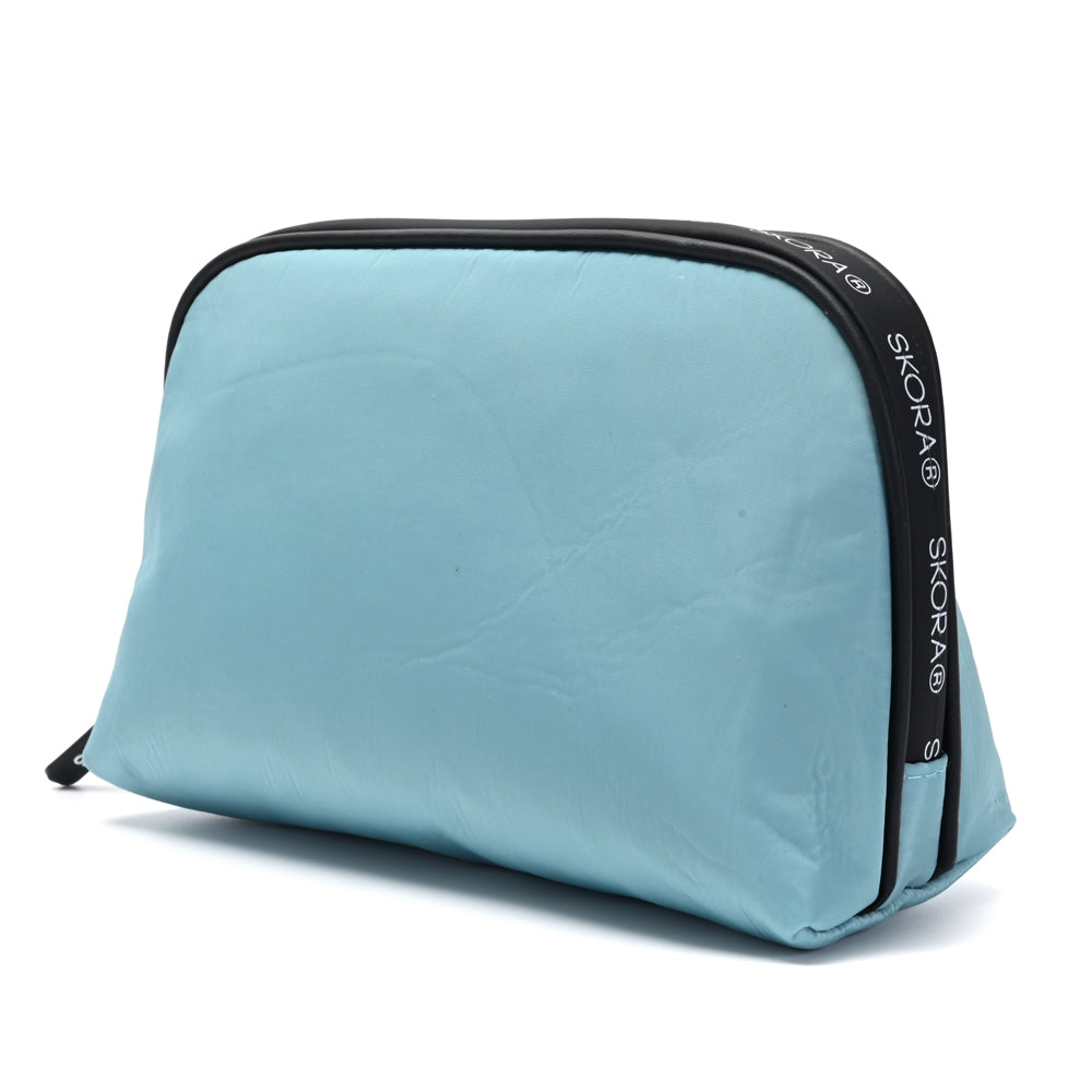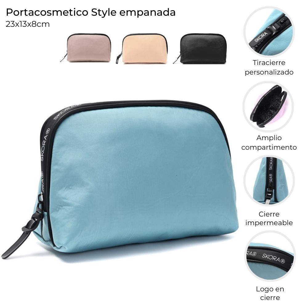 Porta cosméticos Dafne en neoprene engomado iridiscente con cierre termosellado y logo frontal. Estilo audaz y máxima protección en cada uso.