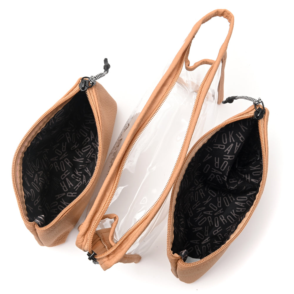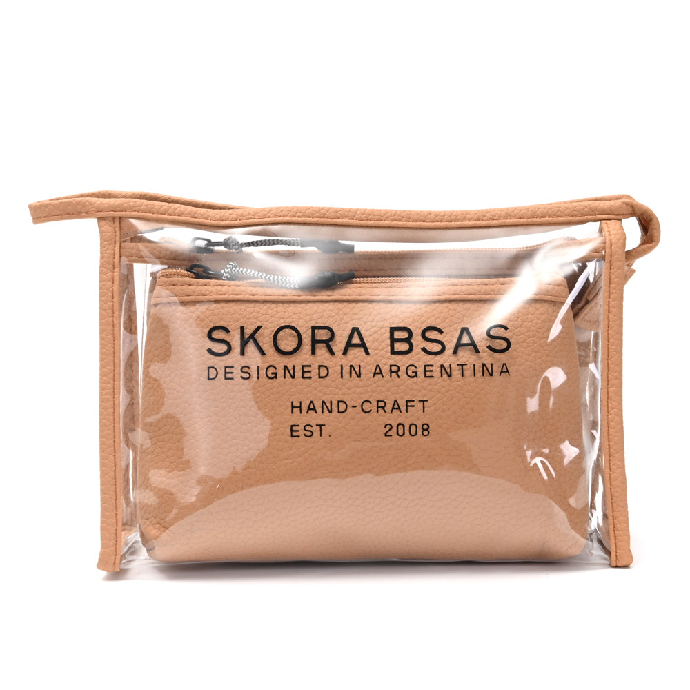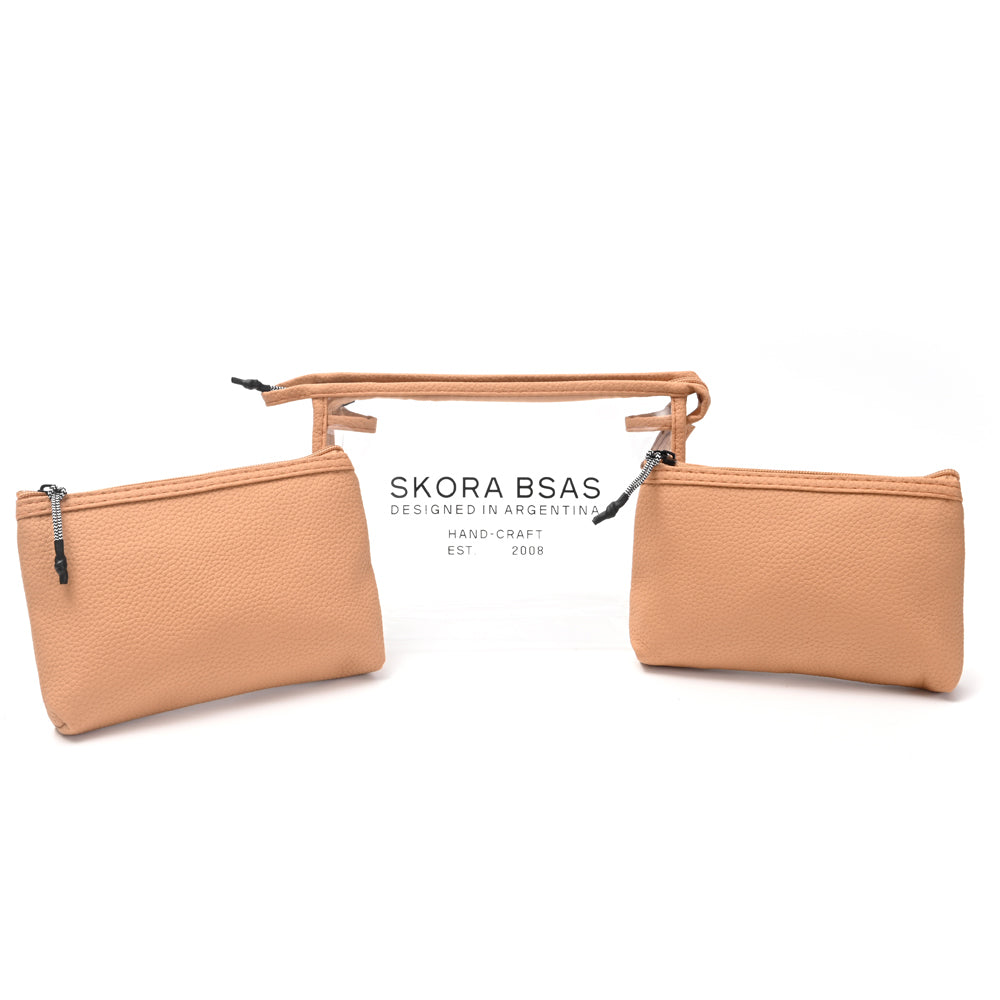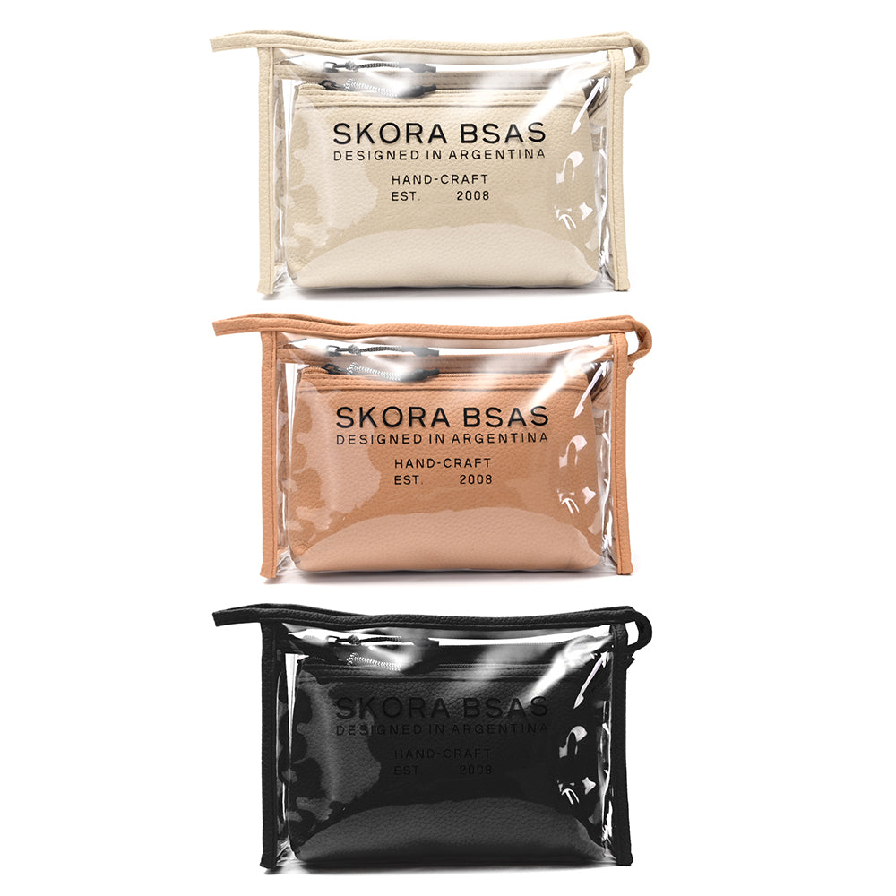Neceser Emilia de 3 piezas en PVC y cuero sintético, con logo estampado. Diseño moderno y audaz para destacar tu personalidad.