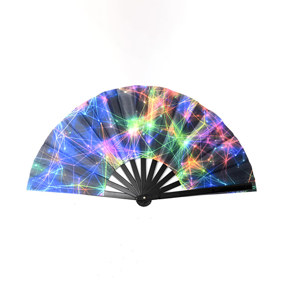 Abanico Festival Breeze confeccionado en poliéster resistente e impermeable. Medidas: cerrado 28 x 4 cm / abierto 28 x 56 cm. Práctico y ligero, ideal para refrescarte con estilo en recitales, playa o salidas al aire libre.