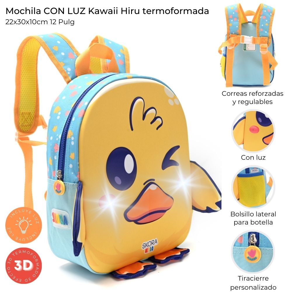 Mochila infantil Hiru termoformada con luz incorporada. Confeccionada en neoprene resistente, correas reforzadas regulables y bolsillo externo para botella. Medidas: 22 x 30 x 10 cm. Ideal para acompañar a los chicos en la escuela o paseos.