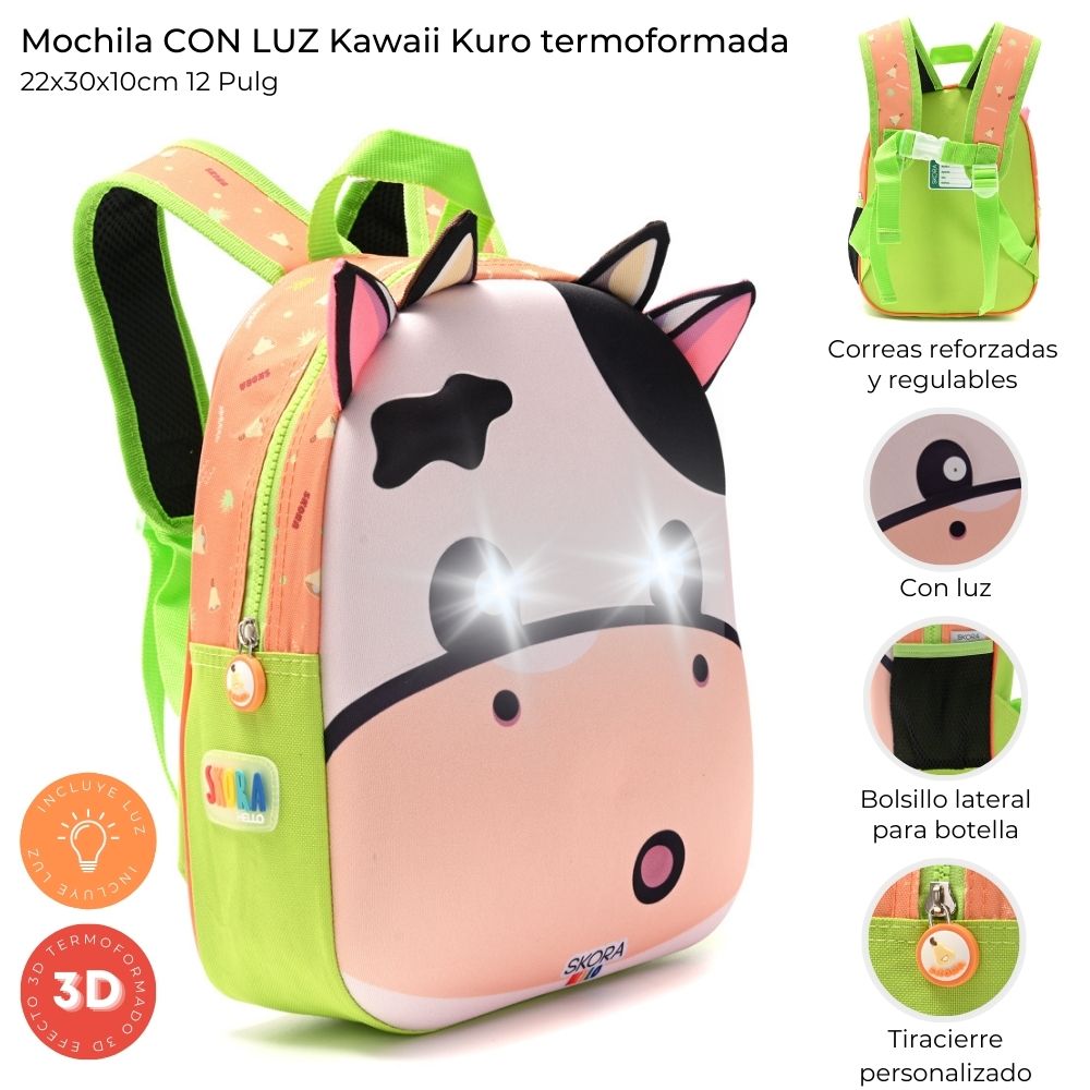 Mochila infantil Kuro termoformada con luz incorporada. Confeccionada en neoprene resistente, con correas reforzadas regulables y bolsillo externo para botella. Medidas: 22 x 30 x 10 cm. Ideal para la escuela y paseos divertidos.