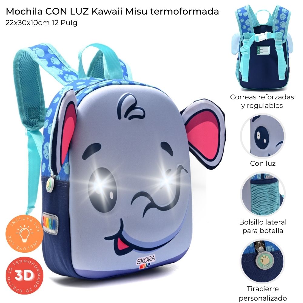 Mochila infantil Misu termoformada con luz incorporada. Confeccionada en neoprene resistente, con correas reforzadas regulables y bolsillo externo para botella. Medidas: 22 x 30 x 10 cm. Ideal para la escuela y paseos divertidos.