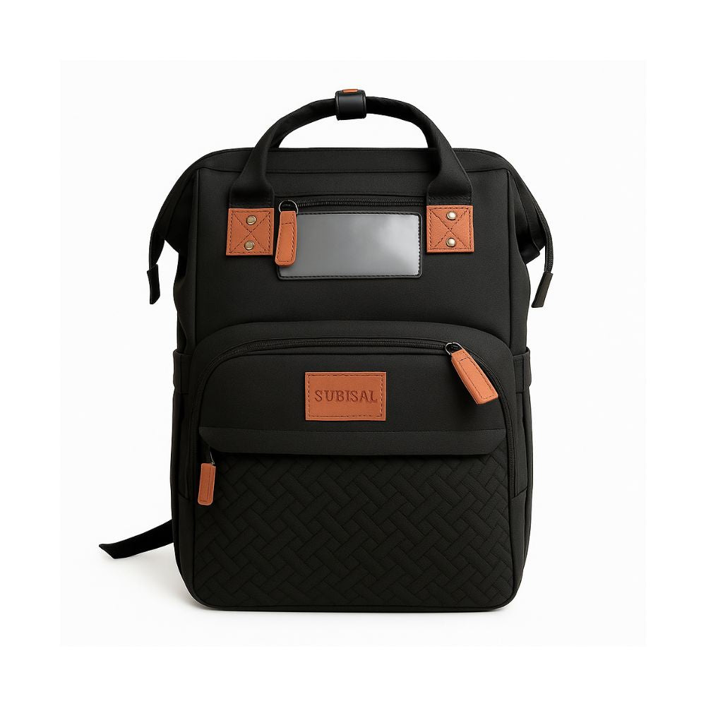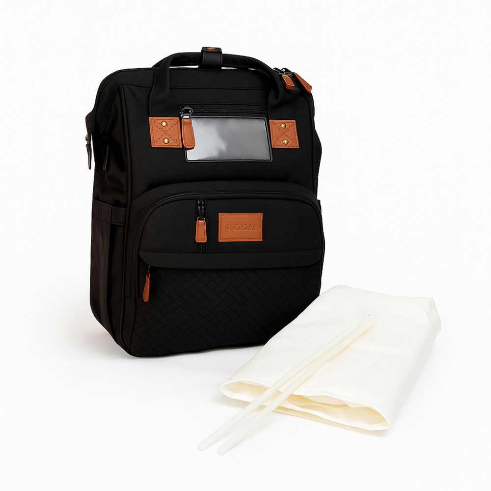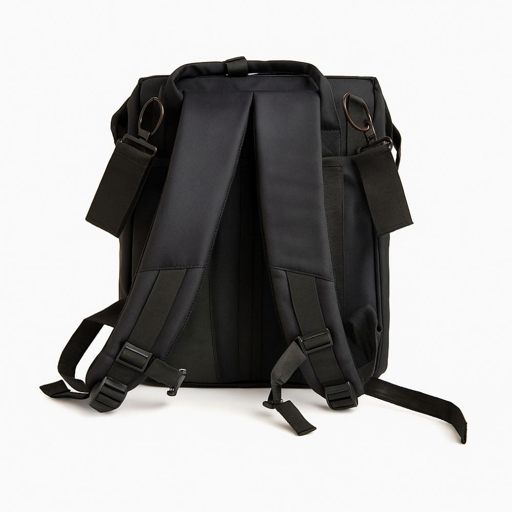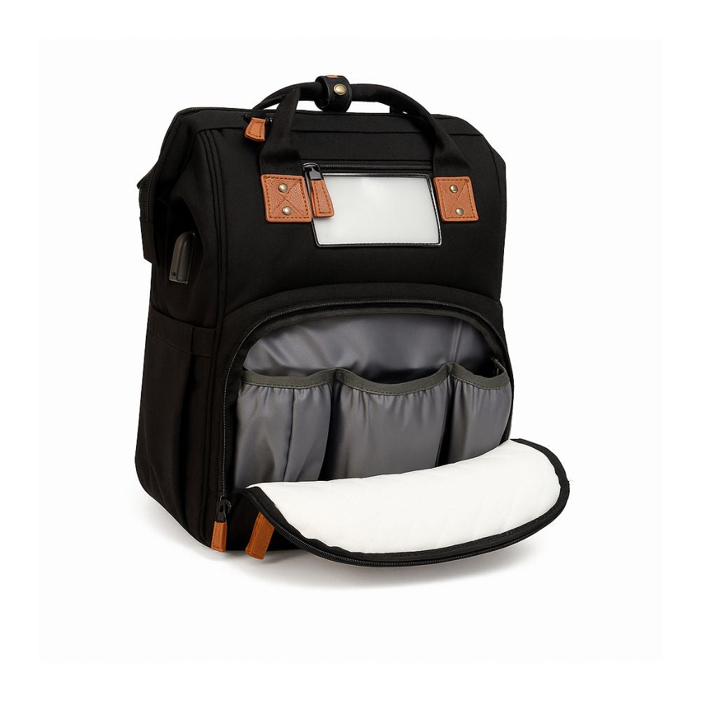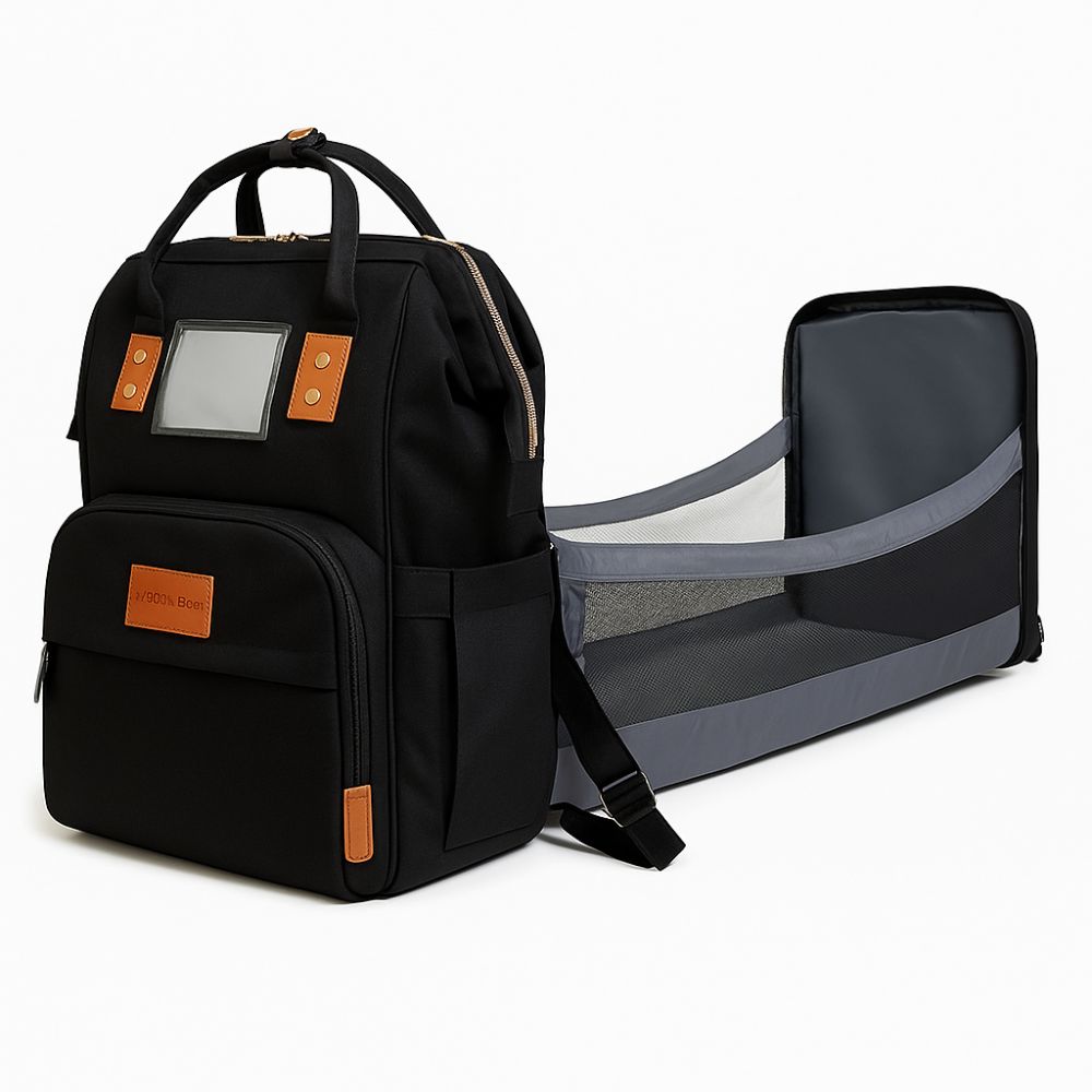 Mochila maternal Cuna multifuncional, confeccionada en cordura resistente. Incluye cuna y cambiador desplegable, puerto USB, varios compartimientos, bolsillos con cierre y bolsillo térmico para mamaderas. Medidas cerrada: 31 x 18 x 40 cm / abierta: 31 x 71,5 x 40 cm.
