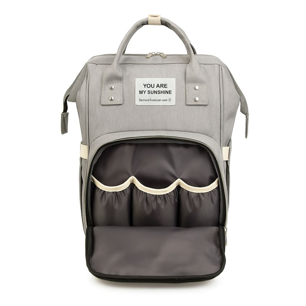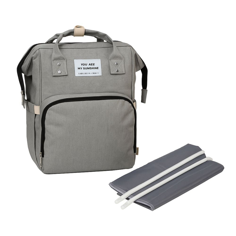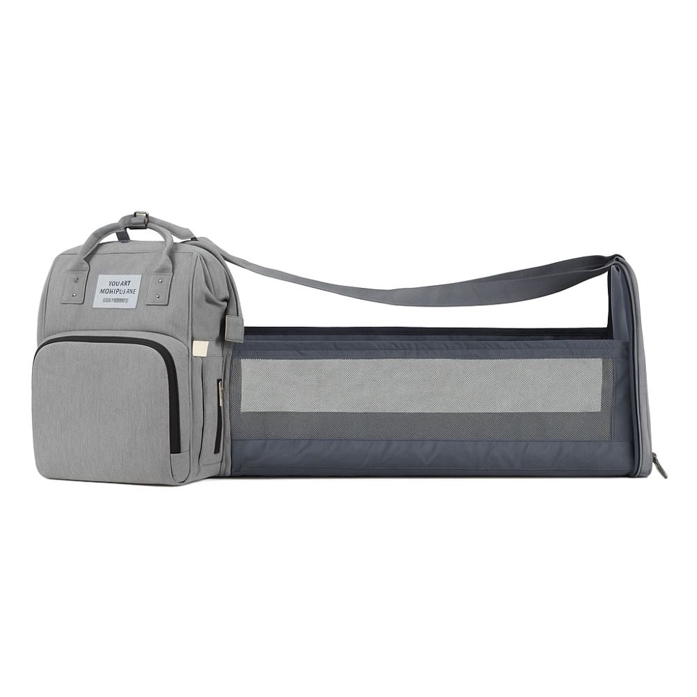 Mochila maternal Cuna multifuncional confeccionada en cordura resistente. Incluye cuna y cambiador desplegable, puerto USB, varios compartimientos, bolsillos con cierre y bolsillo térmico para mamaderas. Medidas cerrada: 31 x 18 x 40 cm / abierta: 31 x 71,5 x 40 cm.
