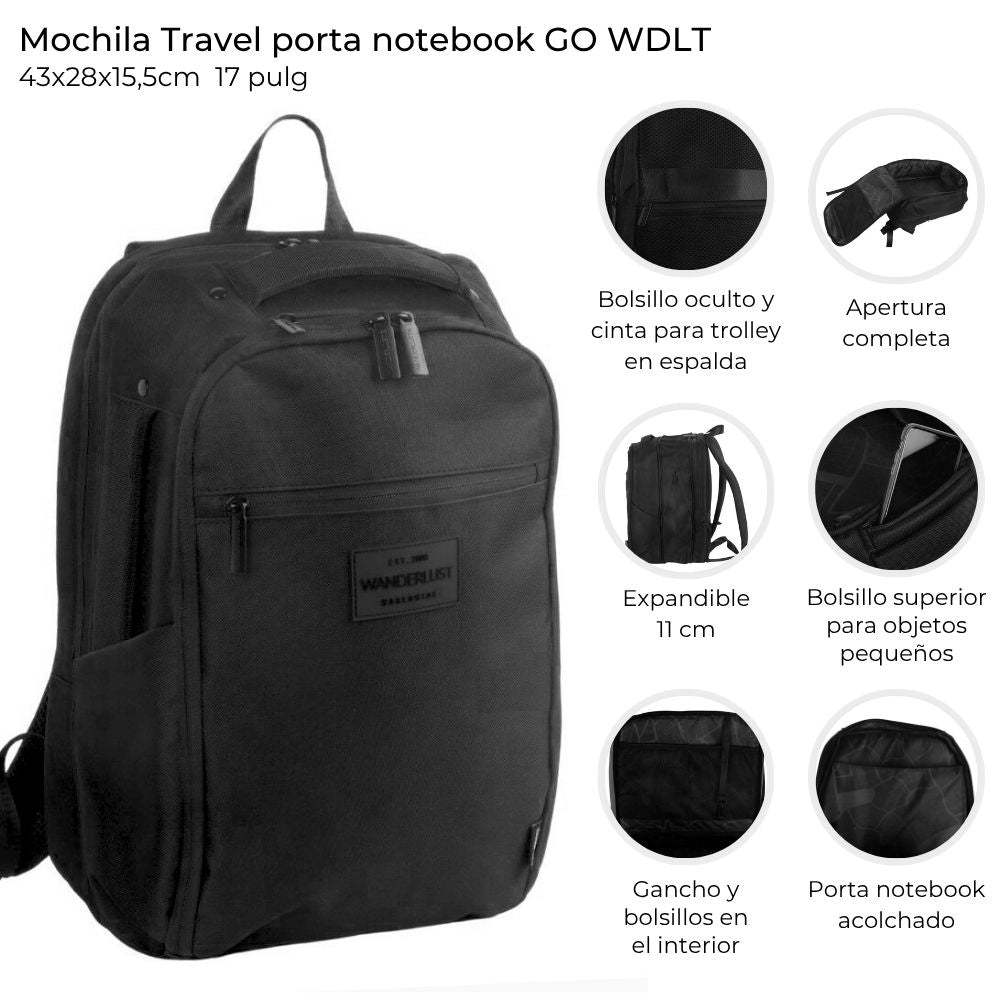 Mochila Travel porta notebook de 17 pulgadas, confeccionada en cordura resistente. Diseño acolchado con compartimento seguro para laptop, múltiples bolsillos, cierre expansible y bolsillo exclusivo para botella de agua. Medidas: 43 x 15,5 cm. Funcional y cómoda para viajes o trabajo.
