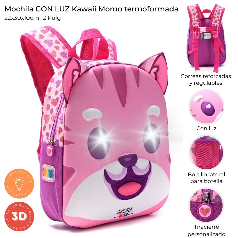 Mochila infantil Momo termoformada con luz incorporada. Confeccionada en neoprene resistente, con correas reforzadas regulables y bolsillo externo para botella. Medidas: 22 x 30 x 10 cm. Ideal para la escuela y salidas divertidas.