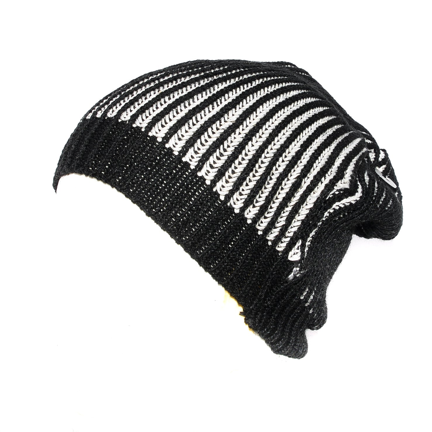 Gorro tejido morley a rayas anchas en tonos negro y blanco.