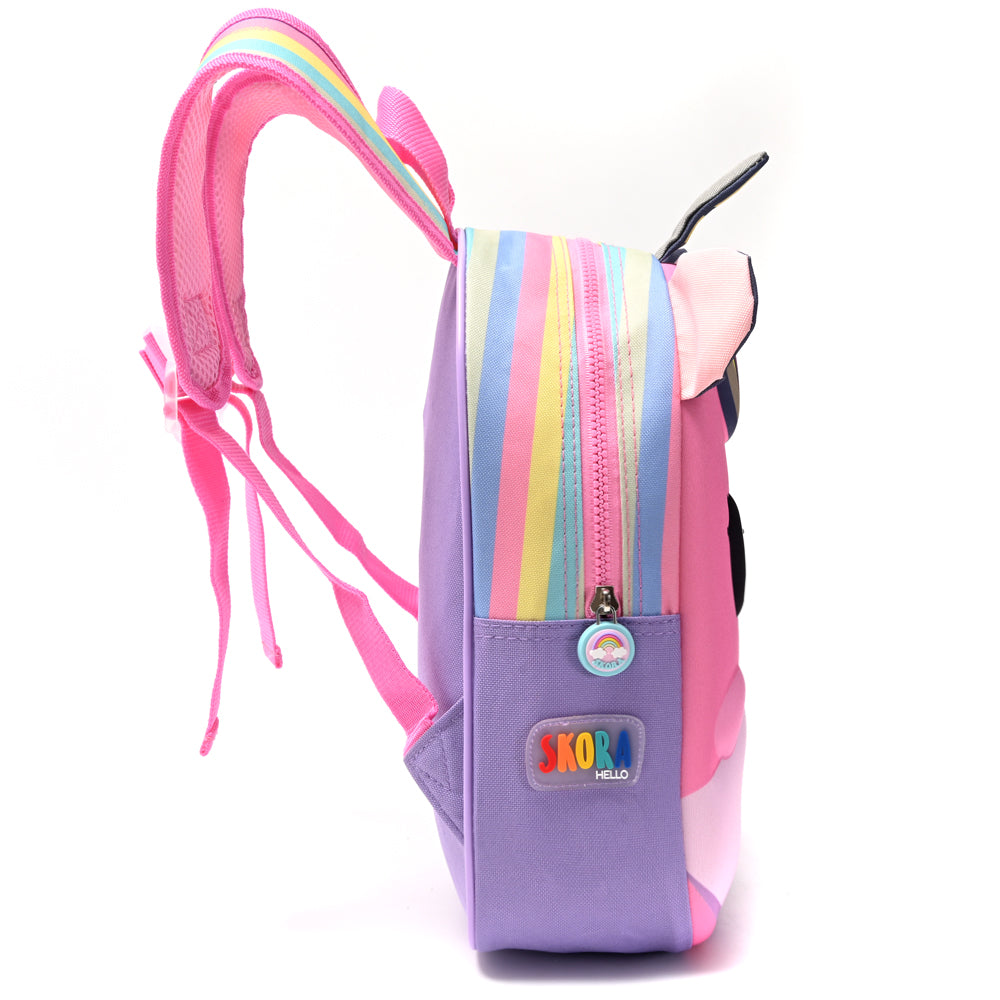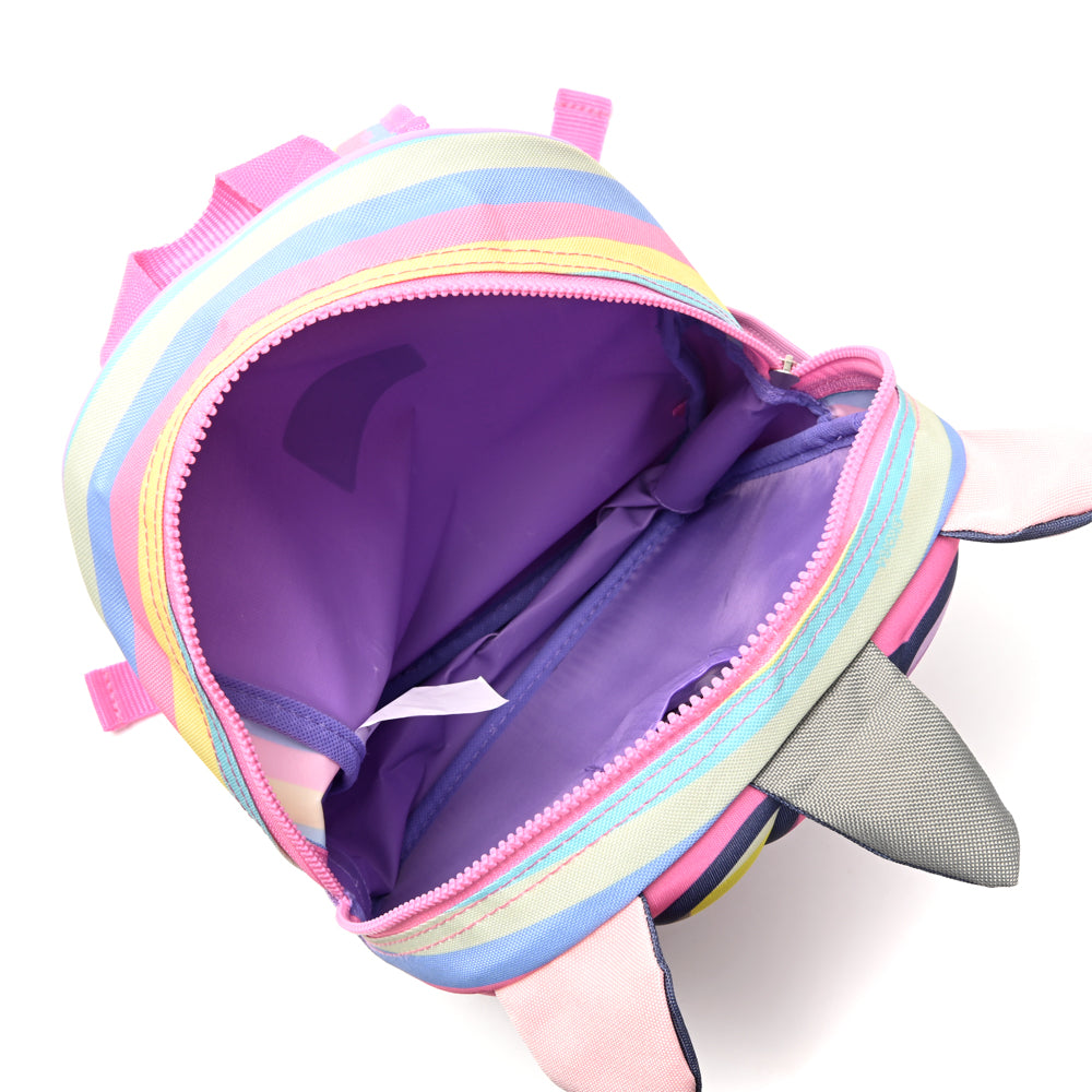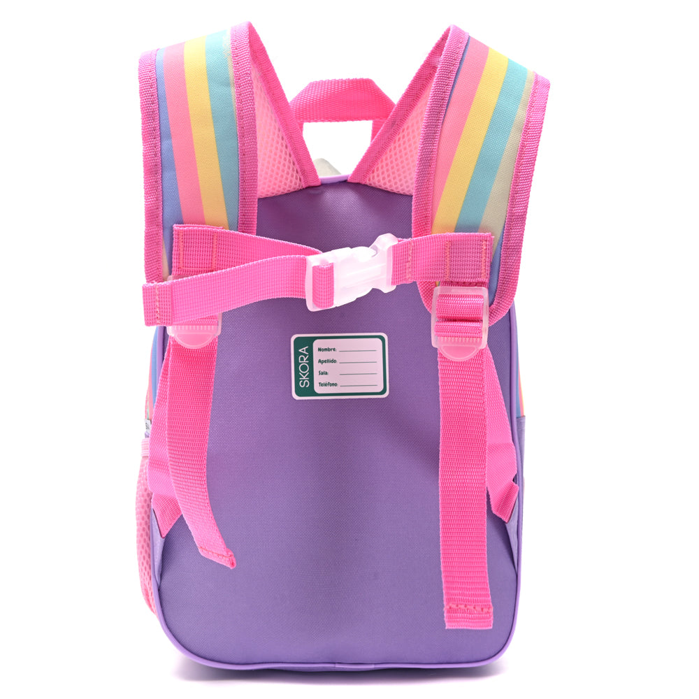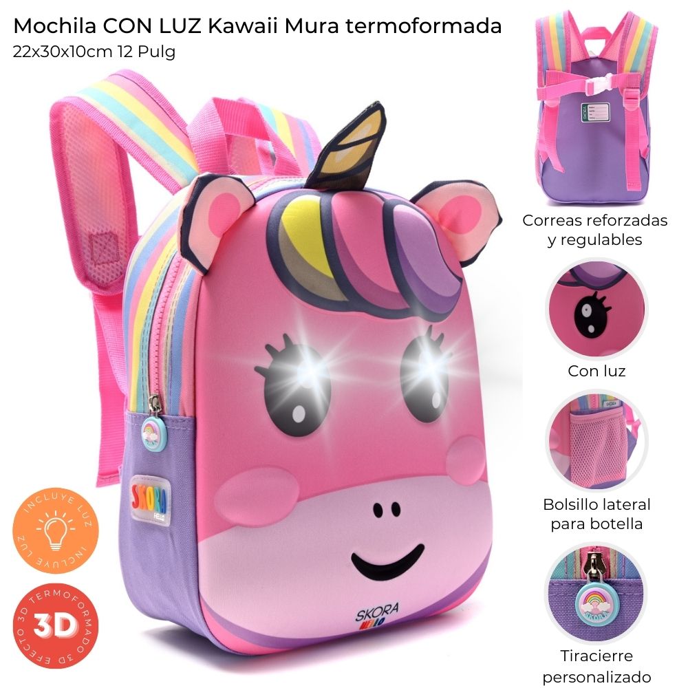Mochila infantil Mura termoformada con luz incorporada. Confeccionada en neoprene resistente, con correas reforzadas regulables y bolsillo externo para botella. Medidas: 22 x 30 x 10 cm. Ideal para la escuela y paseos divertidos.