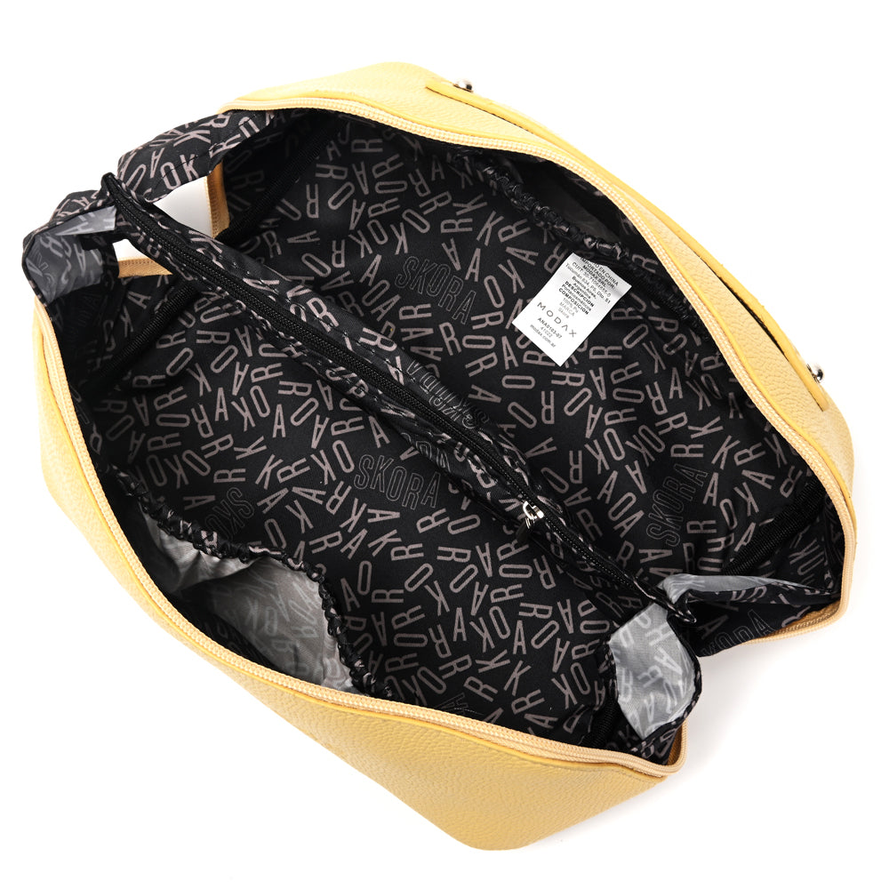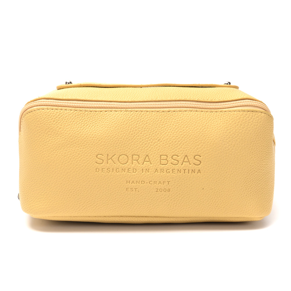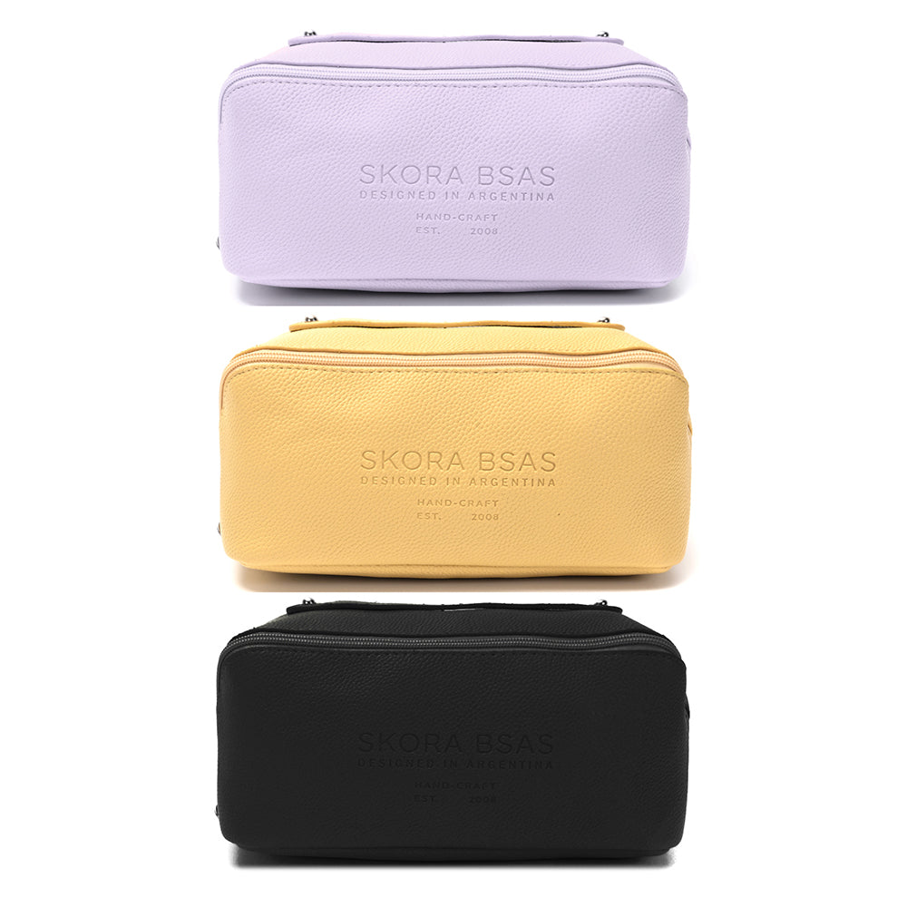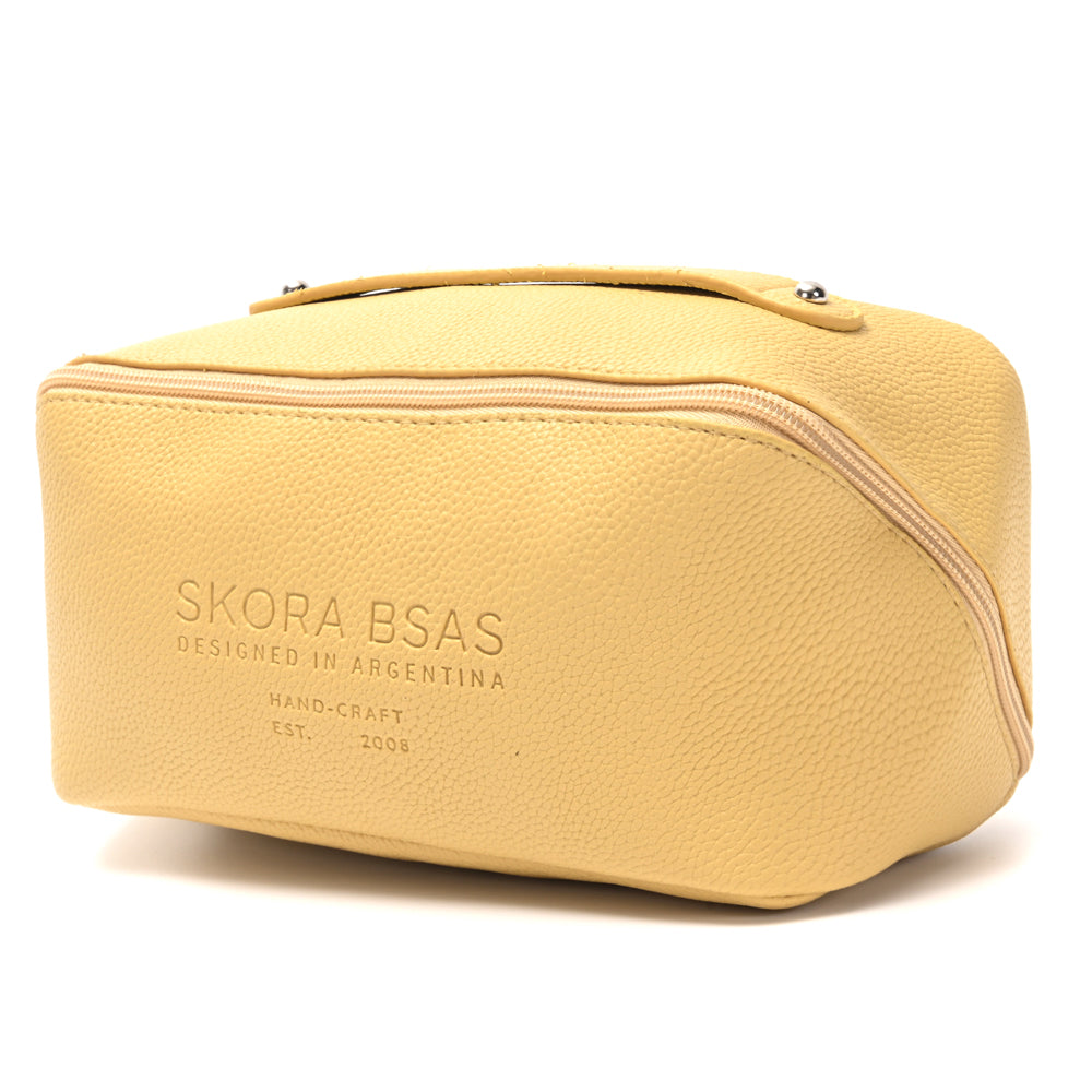 Portacosméticos Nador en eco cuero con diseño elegante y funcional. Su cierre tipo boca de pez facilita una apertura amplia y práctica, mientras que la manija superior lo convierte en un accesorio cómodo para llevar en la mano o dentro de un bolso. El detalle de marca frontal le aporta un estilo sofisticado, ideal para organizar maquillaje, accesorios o artículos de viaje con un toque de distinción.