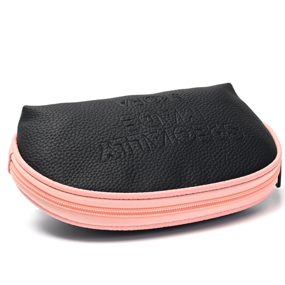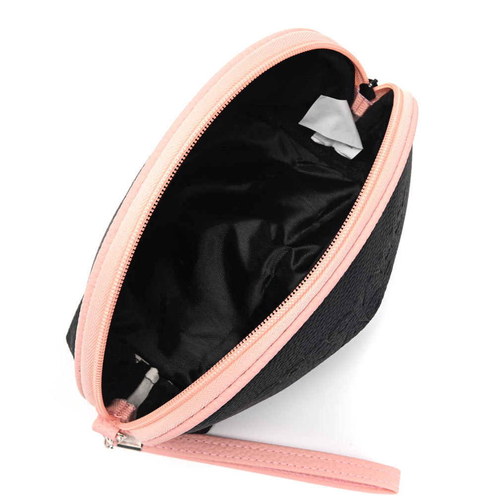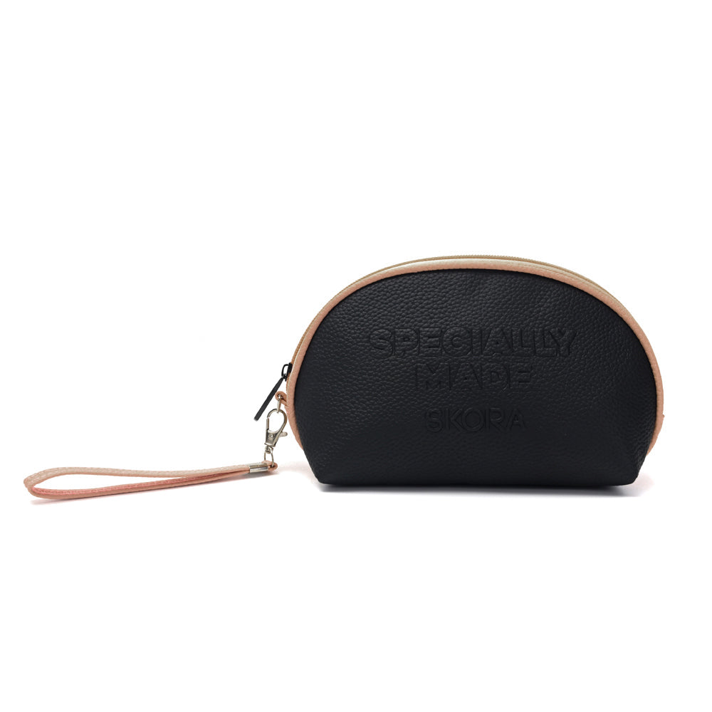 Portacosméticos Nina en cuero sintético de alta calidad, con llavero y logo en relieve frontal. Diseño sofisticado, práctico y compacto.