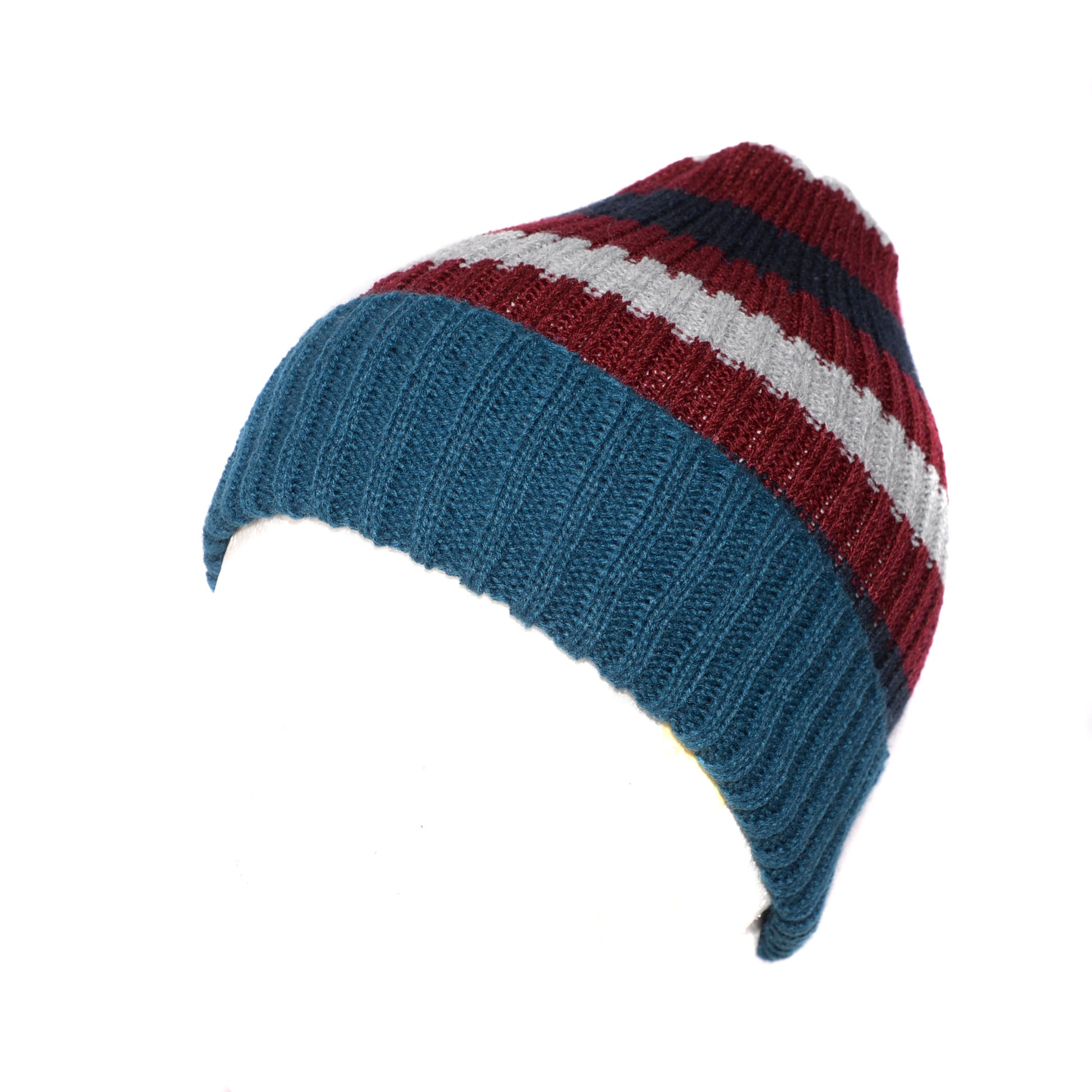 Gorro tejido a rayas anchas en tonos bordo, azul, gris y negro.