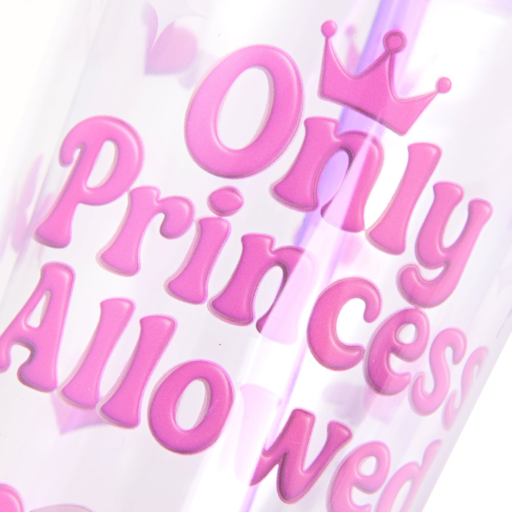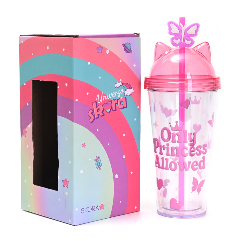 Vaso bicapa Only Princess de 400 ml, fabricado en plástico resistente. Incluye sorbete reutilizable y pin decorativo. Diseño divertido y práctico, ideal para nenas en la escuela o paseos.