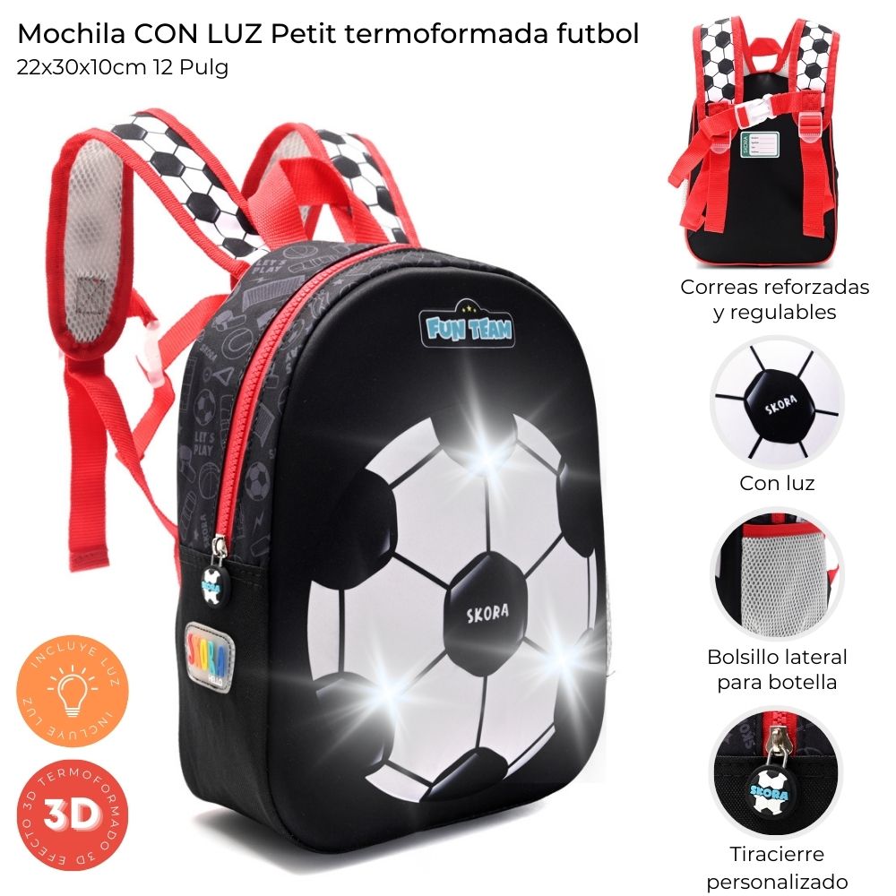 Mochila infantil Petit, confeccionada en neoprene de alta calidad con correas reforzadas y regulables para mayor comodidad. Incluye bolsillo externo para llevar la botella de agua y cuenta con luz incorporada, ideal para acompañar a los chicos en todas sus aventuras. Medidas: 22 x 30 x 10 cm.
