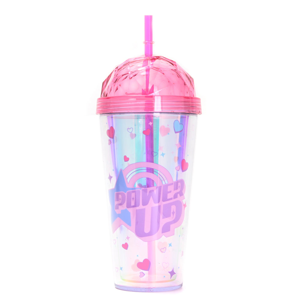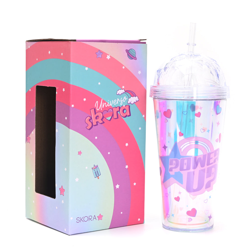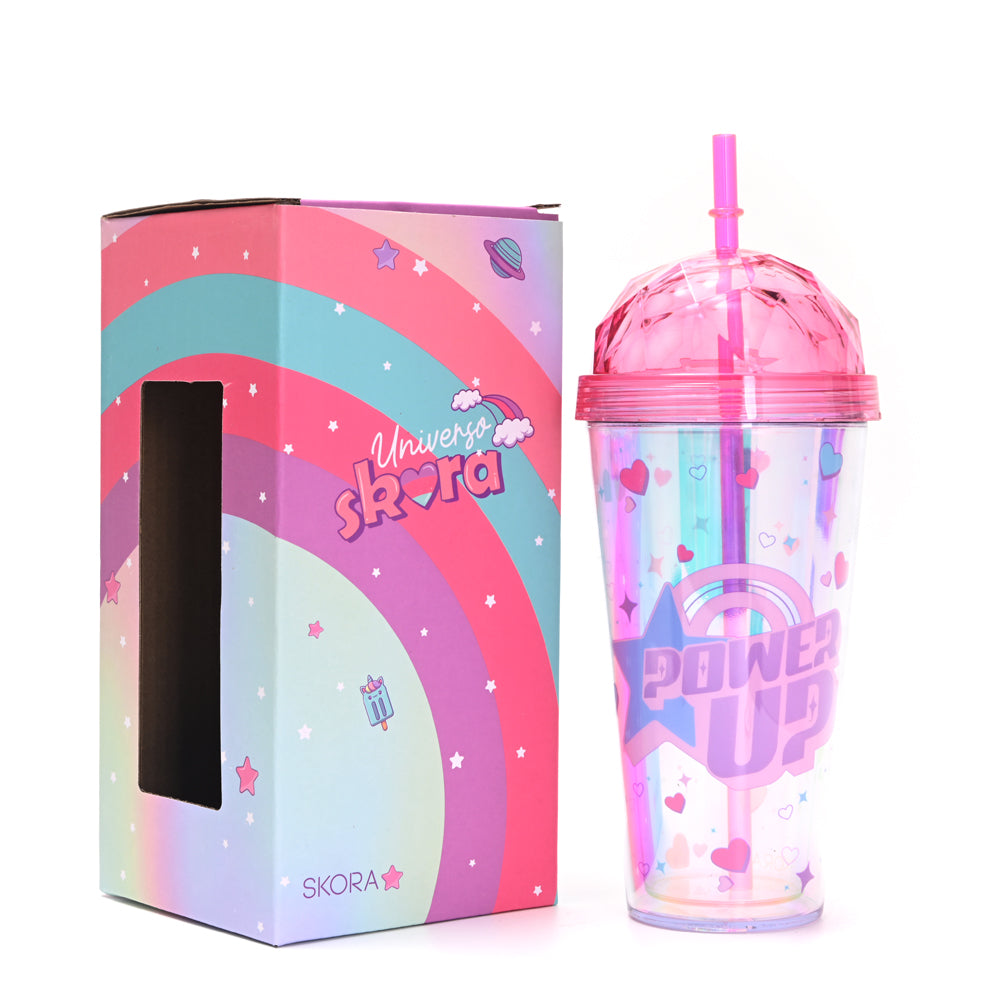 Vaso Power Up, confeccionado en plástico bicapa resistente con capacidad de 400 ml. Incluye sorbete reutilizable y es ideal para mantener tus bebidas frías por más tiempo. Perfecto para el día a día, el colegio o actividades al aire libre.