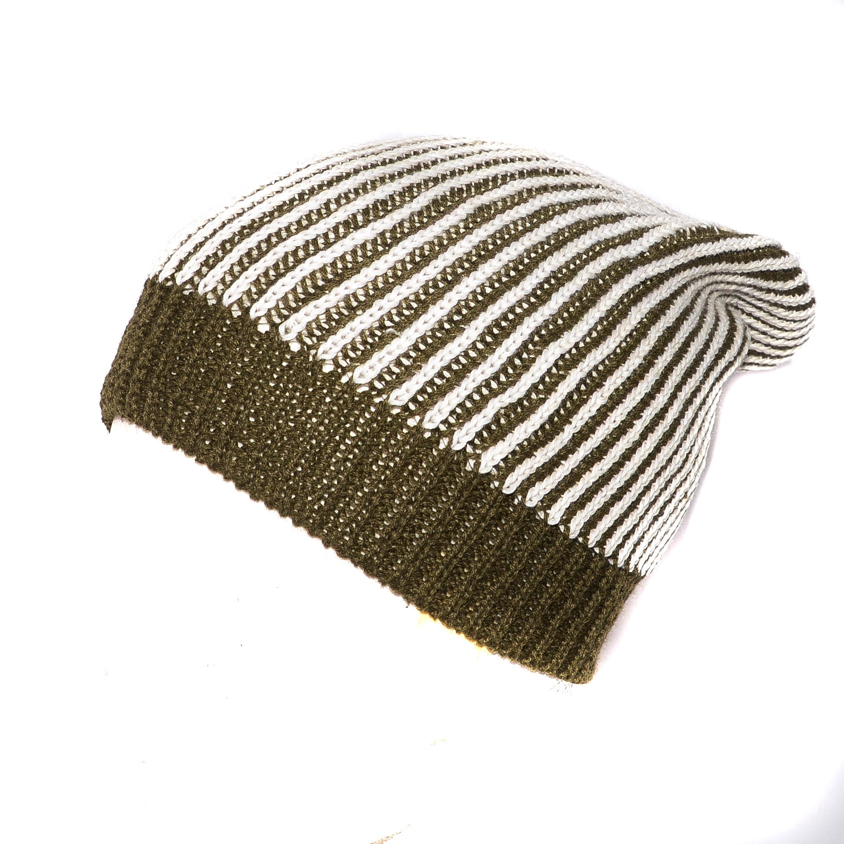 Gorro tejido morley a rayas anchas en tonos blanco y verde militar.