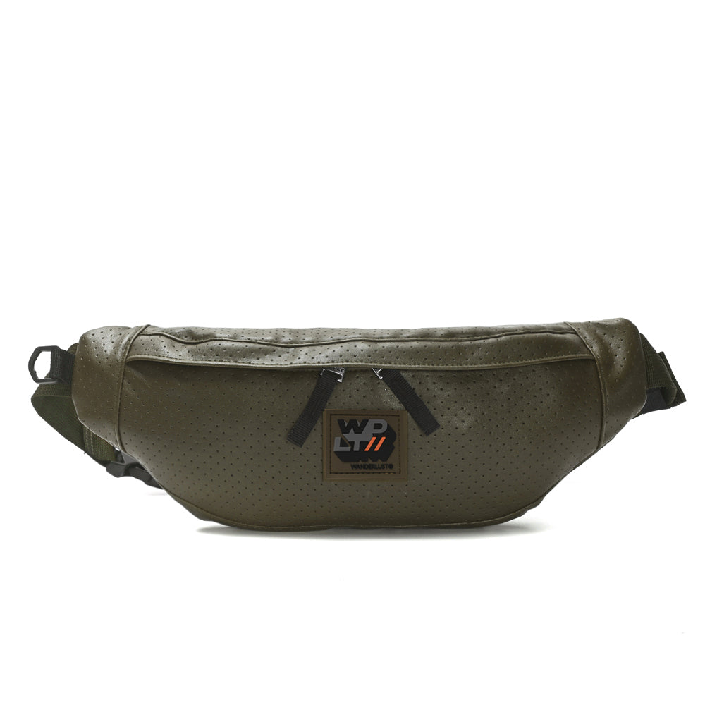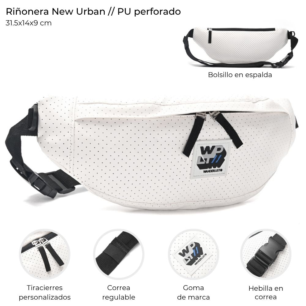 Riñonera confeccionada en cuero sintético P.U con correa regulable, sello de la marca en goma y bolsillo trasero.